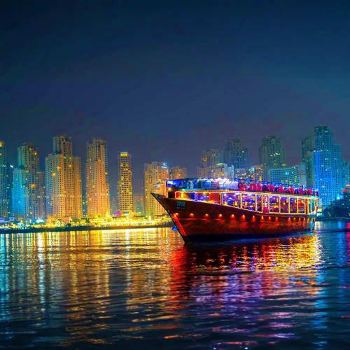 Step aboard our traditional Arabian dhow, beautifully crafted with vintage charm, and sail past the stunning contrast of historic waterfronts and modern skyscrapers along Dubai Creek. Choose between the lower deck, upper deck, or enjoy exclusive access to the entire twin-deck dhow for a truly private celebration.